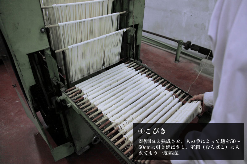「かけば」の工程では、麺を2本の女竹(棒)に8の字を描くようにあやがけし、室箱に入れて熟成させます。さらにそれを手で延ばす「こびき」の工程の後、再び熟成させ「かどぼし」の工程でさらに細く長く延ばしていきます。手延麺の要である「こびき」「かどぼし」は、職人の経験による力加減がポイントです。麺は一気に延ばすことはできず、調子を確認しながら時間をかけて延ばしていきます。度重なる熟成によって麺に粘りが出て、美味しくなります。それを乾燥させれば乾麺の完成です。